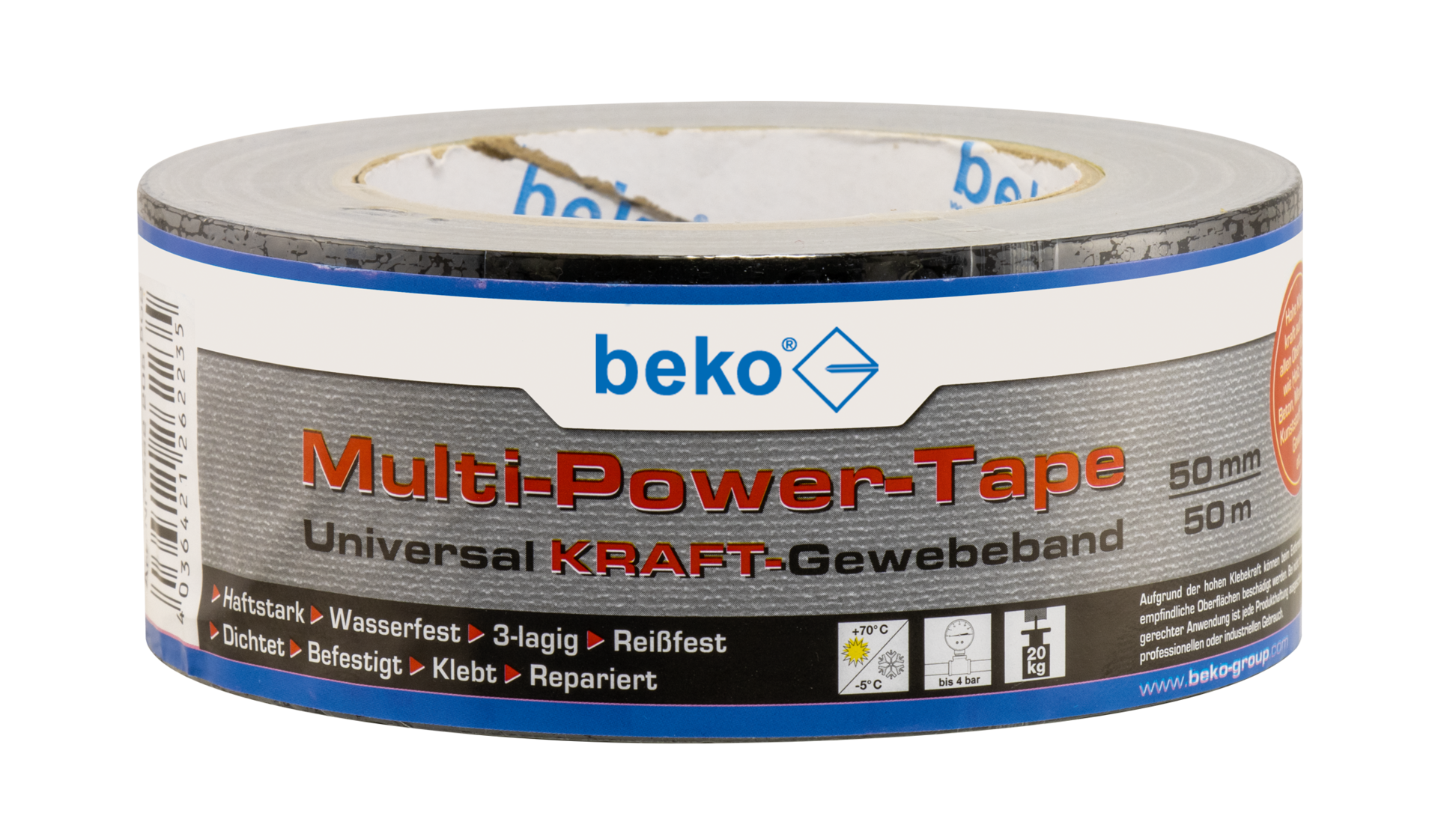 Reißfestes, gewebeverstärktes Kraftband, 3-lagig, zum Befestigen, Reparieren und Abdichten, wasserfest und bis zu max. 4 bar druckdicht, hohe Klebekraft auf fast allen Oberflächen wie Holz, Stein, Beton, Mauerwerk, vielen Kunststoffen, Metall, Gewebe etc., extrem belastbar bis zu 20 kg/Bandbreite, temperaturbeständig bis +70° C.
